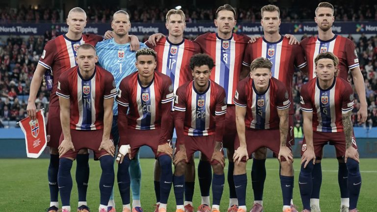 Norges Erling Braut Haaland, Ørjan Håskjold Nyland, Torbjørn Lysaker Heggem, Sander Gard Bolin Berge, Alexander Sørloth, Kristoffer Vassbakk Köpp Ajer, Julian Ryerson, Antonio Nusa, Oscar Bobb, David Møller Wolfe og Patrick Berg før VM-kvalifiseringskampen i fotball mellom Norge og Israel på Ullevaal Stadion.