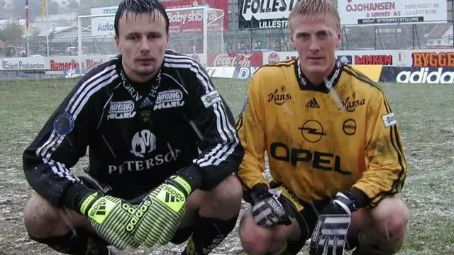 Bildet over viser Rino Hansen (venstre) etter kamp mot Lillestrøm og Runar Kristinsson i 1999. Hansen reddet én og slapp inn et straffespark mot Kristinsson den dagen.